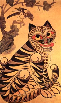 Often tigers were used as comic relief, according to David Mason. With their fierce pride and dignity, they resembled the yangban, or aristocratic class. In images like this tiger, you can see the puffed out chest and aggressive expression, filled with pride about its noble heritage and superiority to all, but, where did those spots come from?