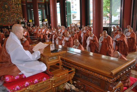 Thus begins the ceremony for the Bodhisattva Precepts in Korea. While laypeople can and do take these precepts, every six months, monks and nuns are required go to their regional head temple for this ceremony.  (It’s  held once a month in meditation halls and sutra study halls, but it’s also held separately for those who aren’t in one of those.) Attendance is required; they actually make us sign in before the ceremony, and then sign out again after it’s over — no signing the ledger and slipping away!  Traditionally, this should be held at least once a month, but there is a lot of overlap with the Thousand Hands Sutra, which is chanted ever day.