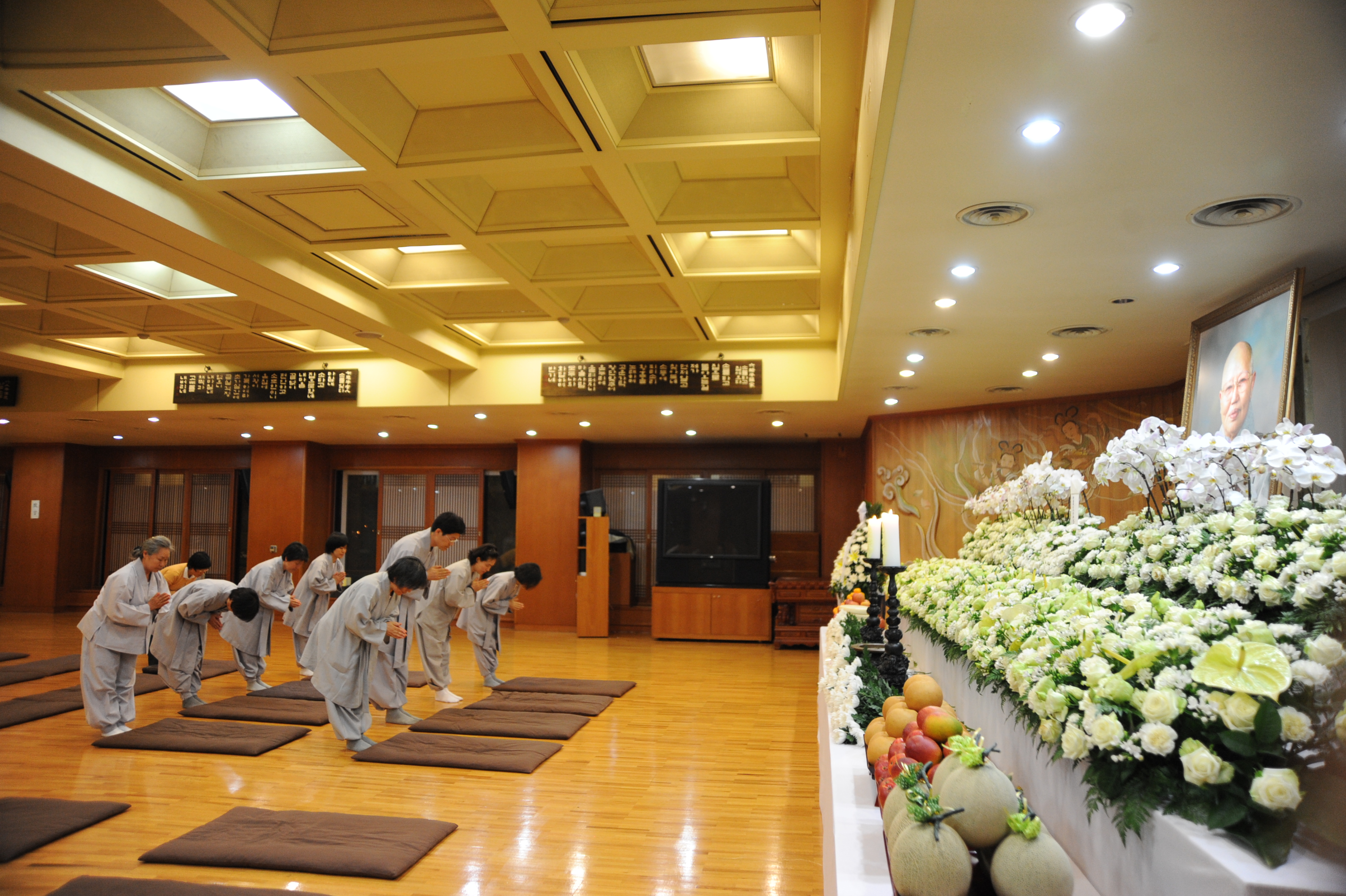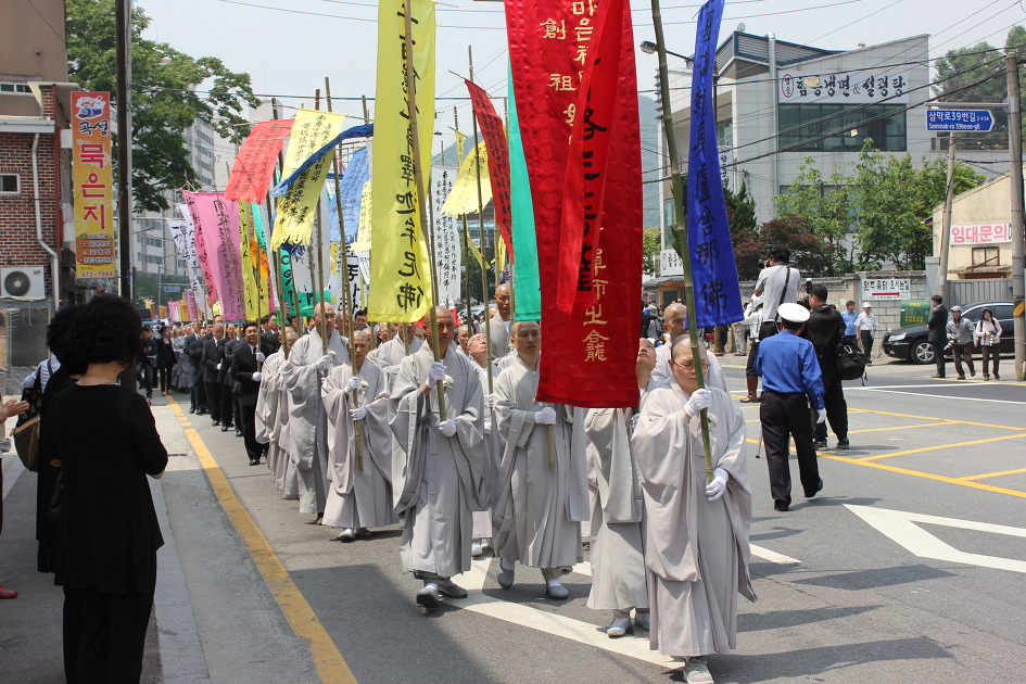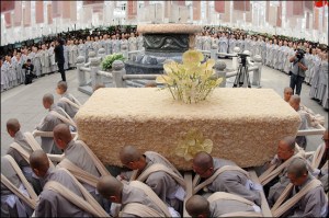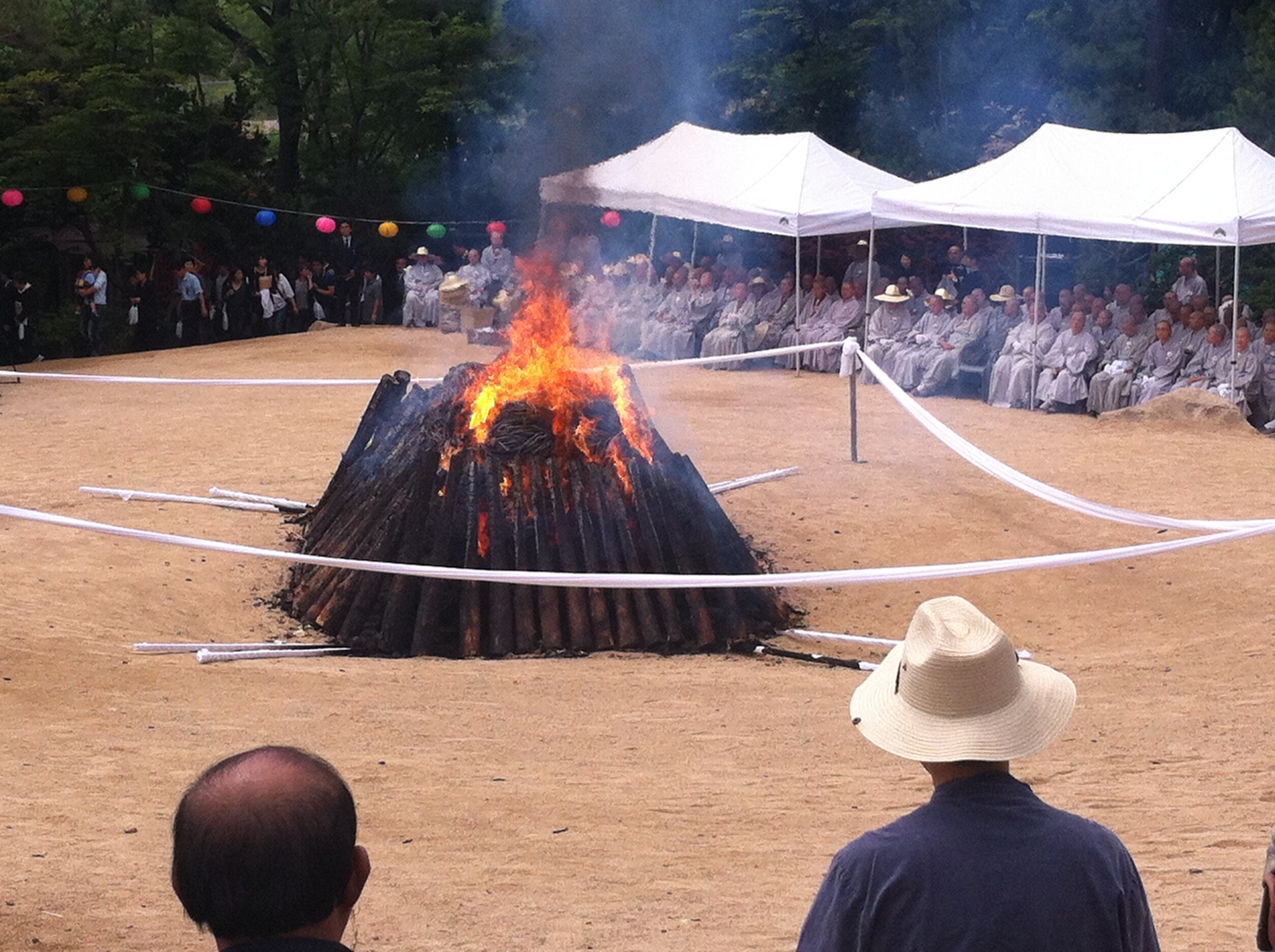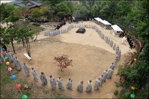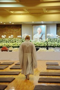 Daehaeng Kun Sunim passed away just after midnight on Tuesday, May 22, 2012. Immediately afterwards, we began to prepare for the funeral, and the people who would be coming to pay their respects. We scheduled the funeral for five days later, both to give people more time to digest what had happened, as well as making it possible for people living overseas to attend the funeral. (The head of our Buenos Aires branch arrived only on the morning of the funeral, after a very long flight that included some odd legs.) Because this all happened right before Buddha’s Birthday, we also had all of the lanterns up, and lit. It was almost as if Daehaeng Kun Sunim chose this time to leave her body, saying “Don’t be too sad.” For all of the bright lanterns really did do a lot to ease the mood.