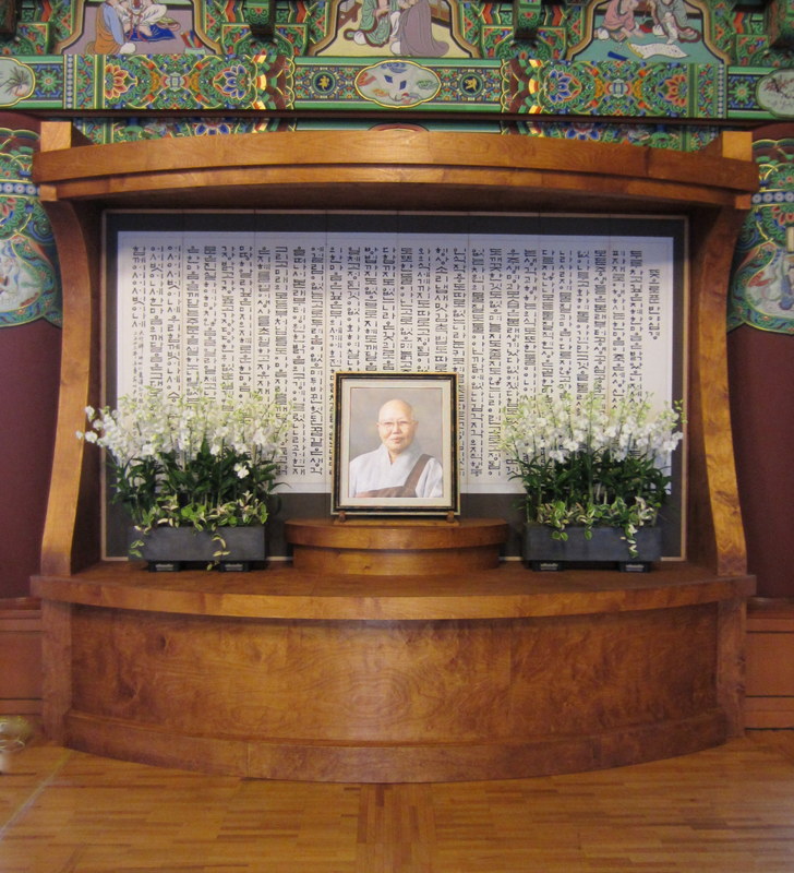 1. how tall is it? not sure the roofed design is a good idea – makes it look small and boxed, and I think white flowers also is not proper flowers anymore- because you don’t put white flowers to Buddha’s stature on the altar, do you, why put white flowers to KunSunim, KunSunim went beyond life and death while she was alive, so why emphasize death at this altar now, it also looks like it was made in haste, well, that’s my opinion because it seems that this would be good for a very good teacher, but KunSunim is much more than that