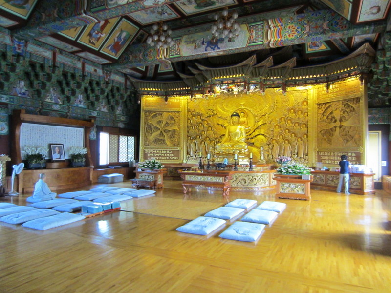 Temples in Korea will often have a “founder’s altar” on the left side of the Dharma Hall. Sometimes this to honor the founder of the temple, and sometimes it’s to honor a great teacher of the temple. In our case, it’s both. This is the altar that was installed a couple of days ago in our Dharma Hall.  I was a bit surprised by the modern style of the design, but I like its clean lines. (Unfortunately, the low light makes this photo look a bit washed out. This is just to the left of the main altar. Tomorrow I’ll  try to add a picture of both.)