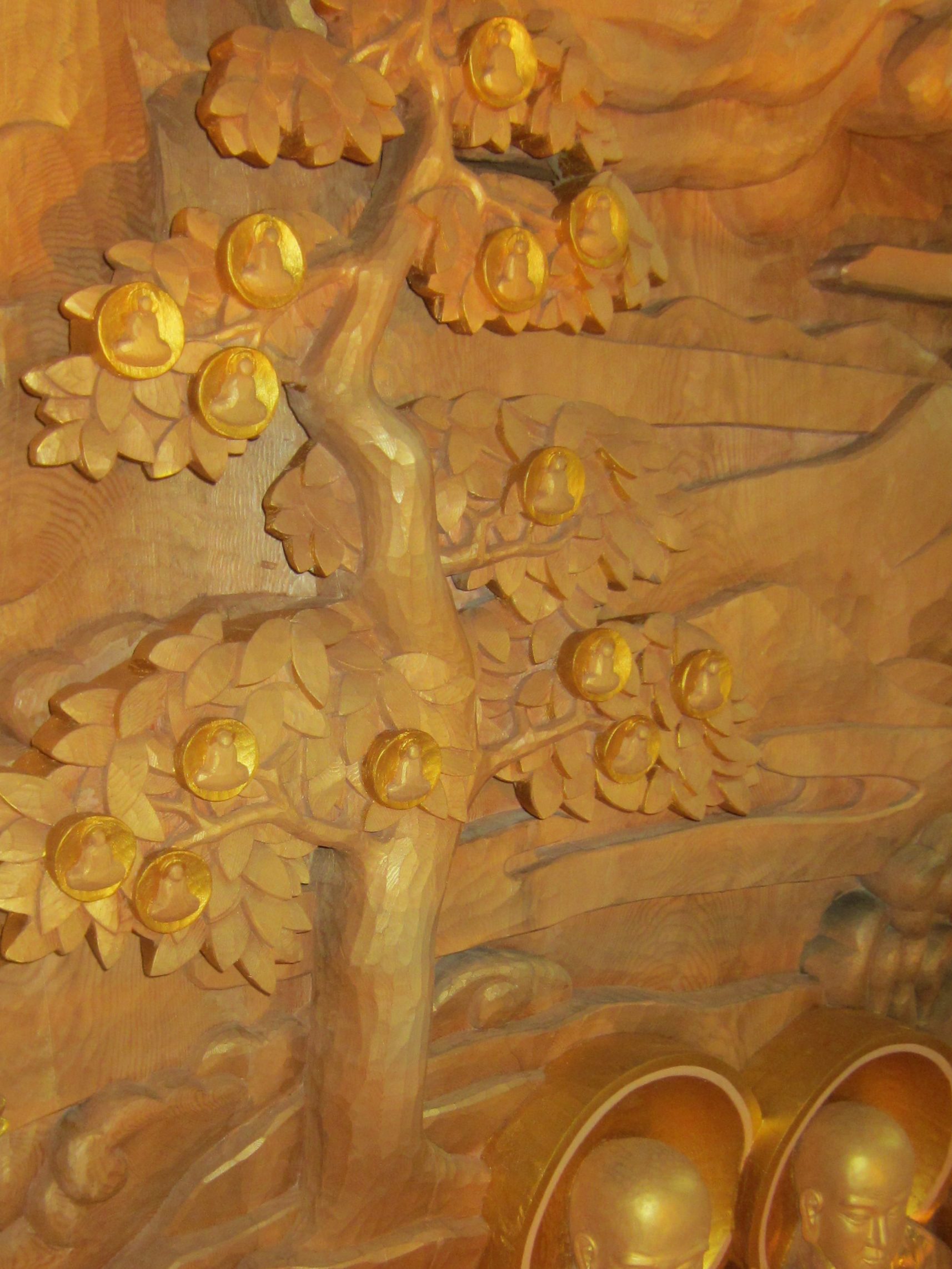 A scene from the wood backdrop in the Dharma Hall at the Gwangmyeong branch