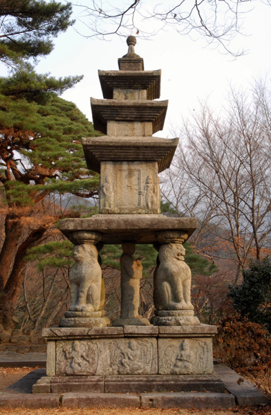 But even more impressive than the massive Gakhwangjeon is what stands on the hill just above this building. On the hill stands the most uniquely designed pagoda (next to the ones at Bulguksa) and stone lantern. The five metre tall granite pagoda has three-tiers on top and four lion-shaped pedestals at its base. Each lion represents the four primary human emotions: love, sorrow, anger, and joy. At the centre of these lions stands a human figure with hands held to his chest. There are numerous other designs etched onto this pagoda, so take your time and enjoy the intricacies of this pagoda. And just in front of this pagoda is the equally unique stone lantern with a squatting figure at the centre of its base. Some have suggested that this is the founder of the temple kneeling in obedience to his mother.