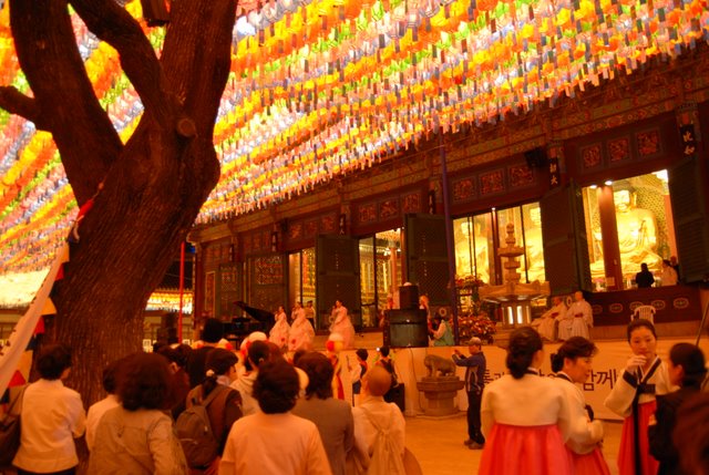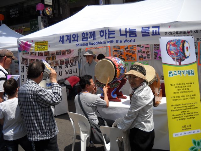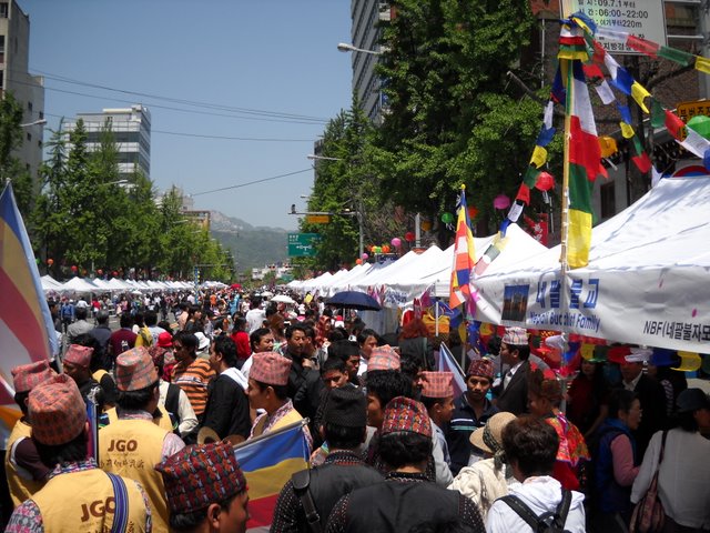 Here are some photos of the Buddha’s Birthday celebrations in Seoul on Sunday. It’s always amazing to see, and Korea feels like a crossroads of Buddhism. In addition to all of the Korean-flavored events, there were booths or floats from every Buddhist country, offering culture and information, food and art. These are a few pictures from the day, with some nice ones contributed by Joseph, of Somewhere in Dhamma. Go ahead and click on the photos to see a larger image.